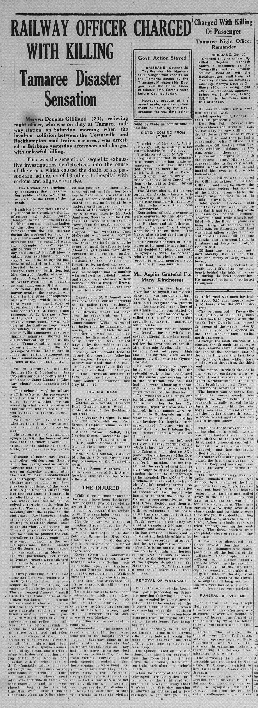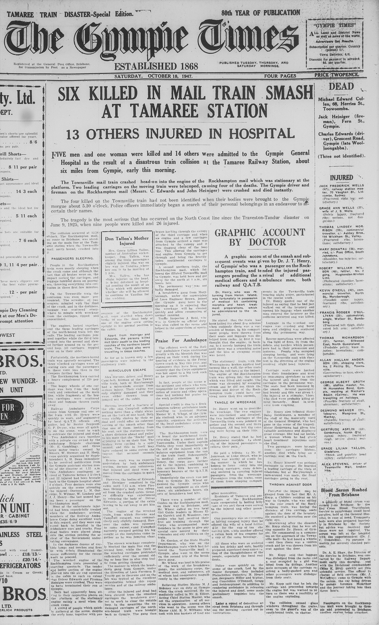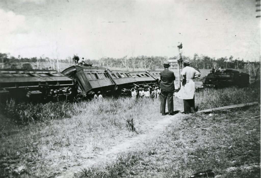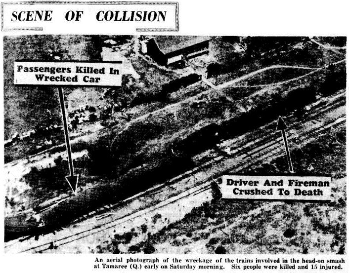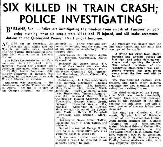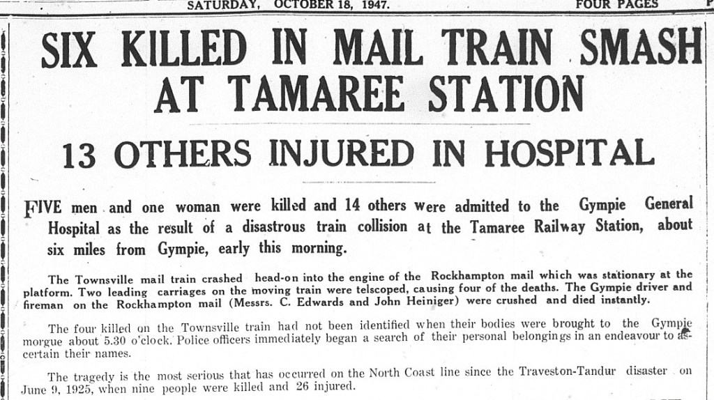 Six people were killed in a train accident at Tamaree on Saturday 18 October, 1947. The south bound Rockhampton to Brisbane train was waiting for the Townsville train to pass on loop when instead the north bound train collided head on with it.
