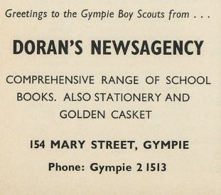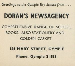 Advertisement for Doran’s Newsagency greeting the Boy Scouts, taken from Scouting in Queensland February 1967, page 30
