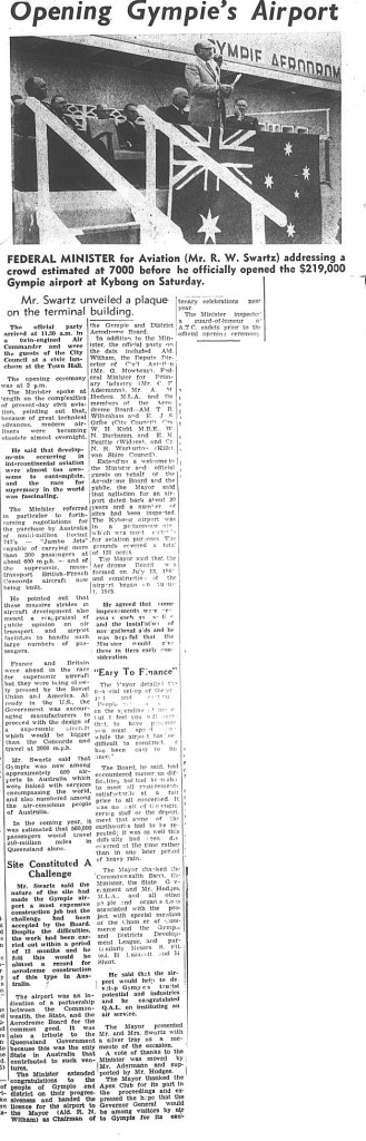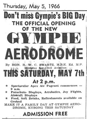 The Gympie Aerodrome opened on Saturday 7 May 1966 to much fanfare. Costing $219,000 the aerodrome was built at Kybong it was opened by the Federal Minister for Civil Aviation Mr. R.W. Swartz at 2pm.