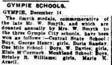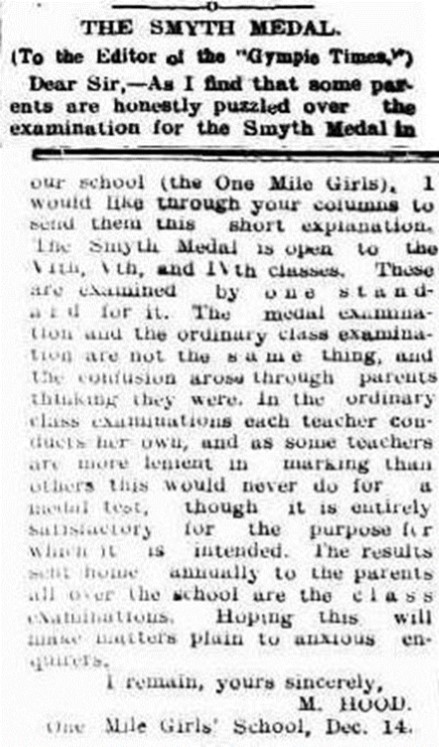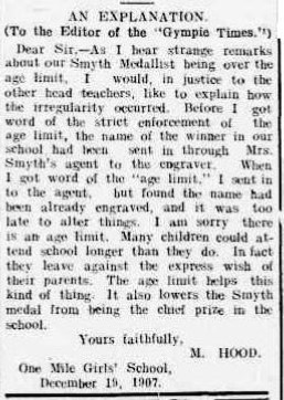 The prestigious award was at times, contentious among parents, with Head Mistress Ms Hood of One Mile Girls School often having to explain or alleviate “anxious” or agitated parents. In 1907, Hood (5) had to alleviate worries via a letter to the editor in The Gympie Times and Mary River Mining Gazette about a recipient being over the age limit. Again in 1908, Ms Hood wrote and addressed (6) confusion over the Smyth Medal examinations, which in turn received replies in further editions of the newspaper (7) (8).