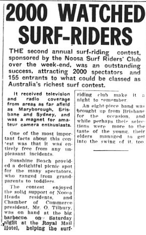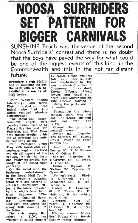 The second annual surf-riding contest at Noosa was held over the weekend of 16-18 September 1969. The event attracted over 2000 spectators and 155 entrants.