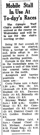 The video comes to us with a note of it being September 1965 and we found information relating to a new mobile starting gate for Gympie. Unfortunately we cannot confirm if the video is the 1965 race meeting, however read the Gympie Times articles below about the mobile gate.
