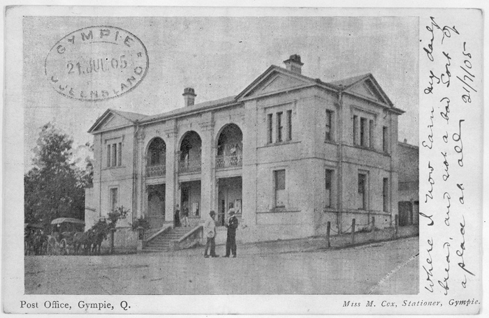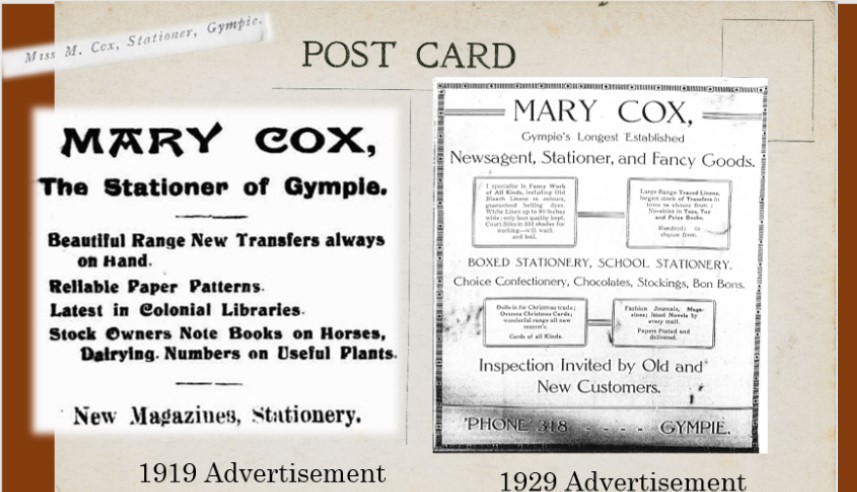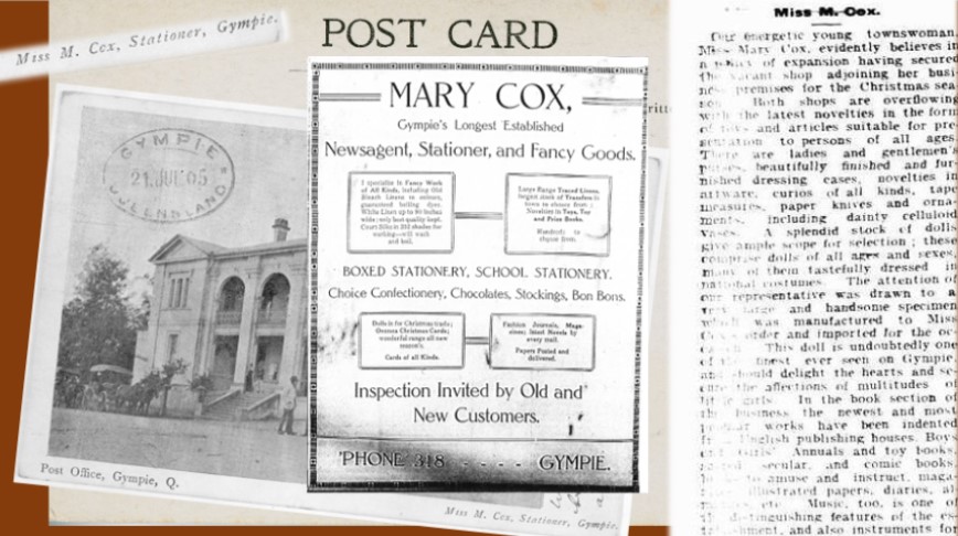 “Miss M. Cox – our energetic young townswoman Miss Mary Cox, evidently believes in a policy of expansion having secured the vacant shop adjoining her business premises for the Christmas season. Both shops are overflowing with the latest novelties in the form of toys and articles suitable for presentation to persons of all ages. There are ladies and gentlemen’s purses, beautifully finished and furnished dressing cases, novelties in artware, curios of all kinds, tape meaures, paper knives and ornaments including dainty celluloid vases. A splendid stock of dolls give ample scope for selection; these comprise dolls of all ages and sexes, many of them tastefully dressed in national costumes. The attention of our representative was drawn to a very large and handsome specimen which was manufactured to Miss Cox’s order and imported for the occasion. This doll is undoubtedly one of the finest ever seen on Gympie and should delight the hearts and secure the affections of multitudes of little girls. In the book section of the business, the newest and most popular works have been indented from English publishing houses. Boys and Girls’ Annuals and toy books, sacred, secular and comic books, books to amuse and instruct, magazines, illustrated papers, diaries, almanacs, etc. Music, too, is one of the distinguishing features of the establishment, and also instruments for producing it, from the stately piano to the tin whistle. The stock on the whole is varied, and up to date in every respect and no doubt the enterprising young lady proprietor will meet with her full share of public support”