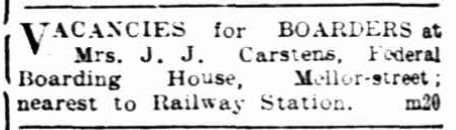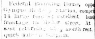 In 1915, the Federal Boarding house was listed for sale (looking for a quick sale, listed as a bargain). It seems the buyer was Thomas Hansen, as council records indicate his ownership from around 1916 until the end of 1925.