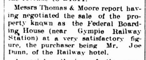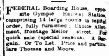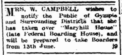 Mrs W. Campbell notifies the public of Gympie and surrounding districts that she has taken over “Maryhill House” (late Federal Boarding House).
