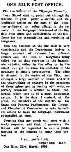 A letter written by a “Business Man” to The Gympie Times, in 1905, points out the “serious and unjustifiable action on part of the Postmaster-General or other official in the removal of the telegraph instrument at the One Mile Post Office and substitution of the telephone for the transmitting and receiving of telegrams”….