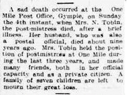 Mrs N. Tobin sadly passed away in 1912 at the One Mile Post Office. Mrs Tobin was the postmistress at the One Mile Post office for three years and the mother of seven children. Her husband Mr Tobin had passed nine years prior.