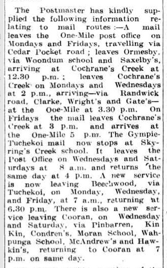 The One Mile Post Office route as published on 9 January 1912 in The Gympie Times…
