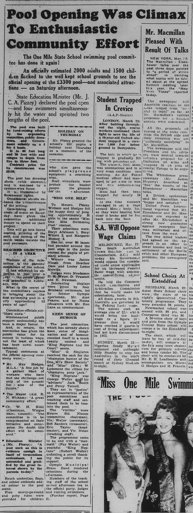 Take a look at photos and the reported article in The Gympie Times from day including “Miss One Mile Swimming Pool”…..