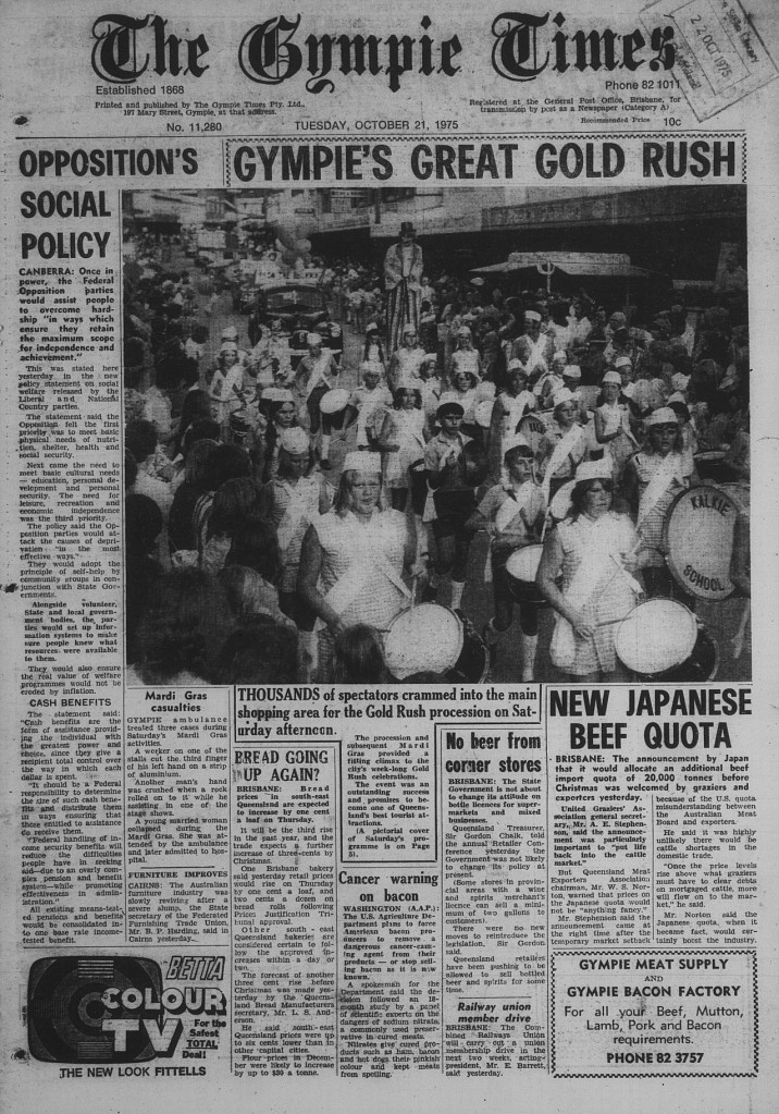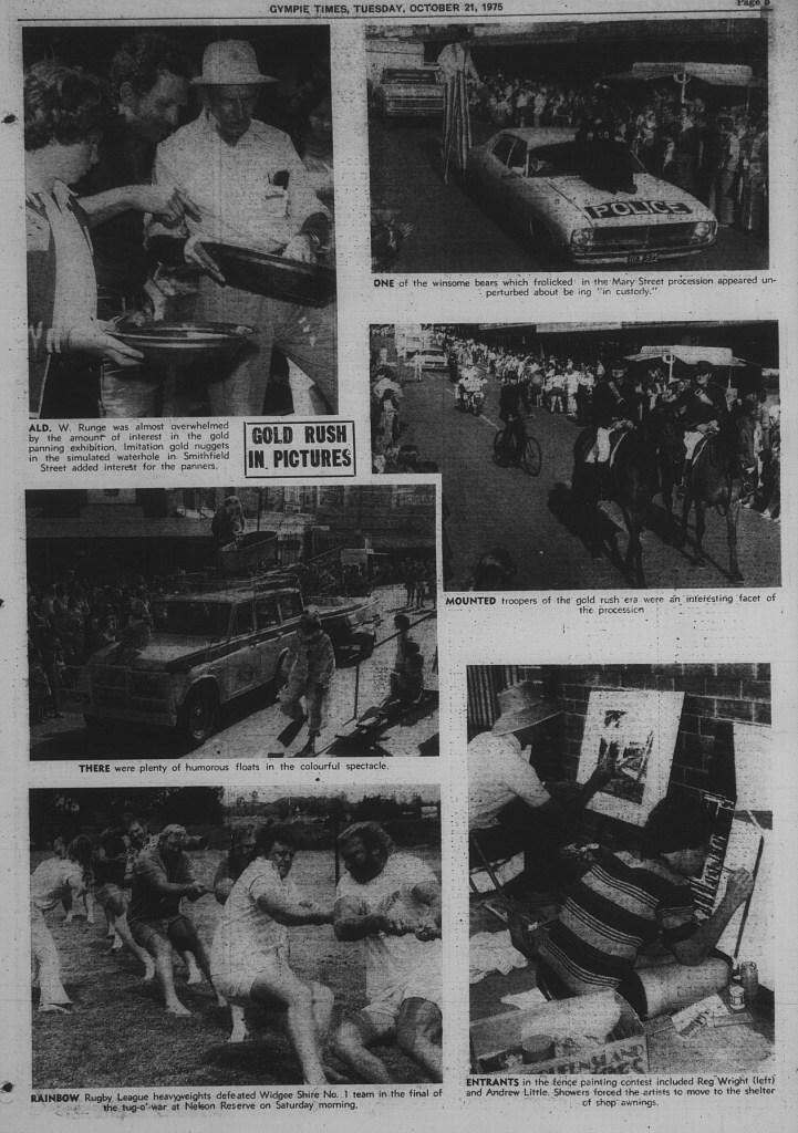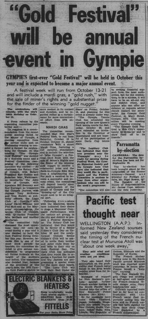 December 29, 2021December 29, 2021 gympieregionallibraries Gympie’s Gold Rush Festivals- The First Years…. 1973, 1974, 1975 The Gympie Times, 14 July 1973, page 1 1974 Gold Rush Images (F. Long Collection) The Gympie Times, 21 October 1975. p. 1 The Gympie Times, 21 October 1975, p. 2 The Gympie Times, 21 October 1975 Share this: Click to share on X (Opens in new window) X Click to share on Facebook (Opens in new window) Facebook Like Loading... Related