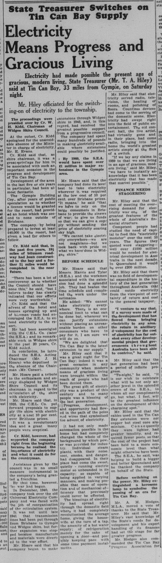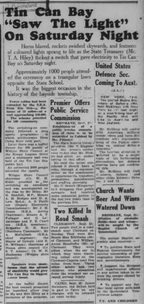 December 31, 2021December 31, 2021 gympieregionallibraries Tin Can Bay – it’s electric! September 1959 was a significant time in the bay …. The Gympie Times, 17 September 1959 The following articles were published on 22 September 1959…. Share this: Click to share on X (Opens in new window) X Click to share on Facebook (Opens in new window) Facebook Like Loading... Related
