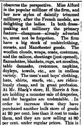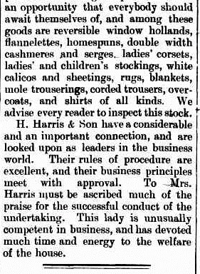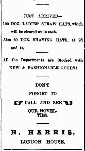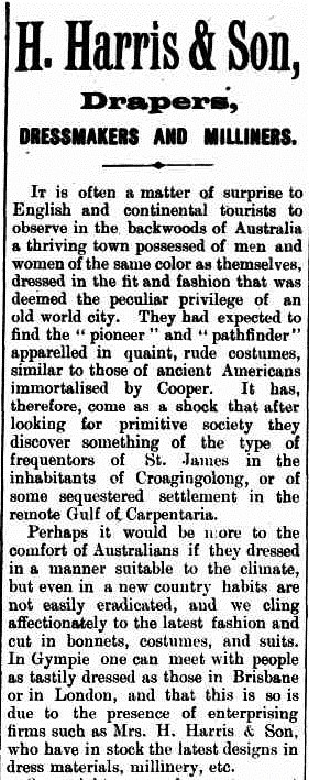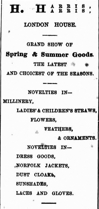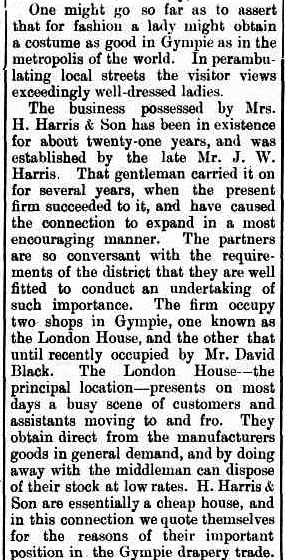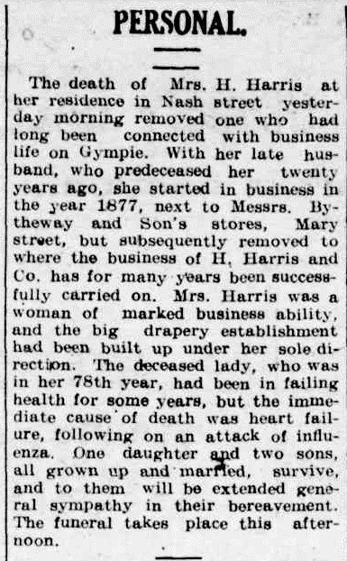 In 1877, Mrs Harris first commenced her drapery, millinery & women’s fashion business next to Messrs Bytheway and Sons stores in Lower Mary Street. Later, the business “H. Harris & Co / H. Harris & Sons” moved a few more doors to equivalent 25-29 Mary Street, the building known as “London House”. She lived on Nash Street behind the store.