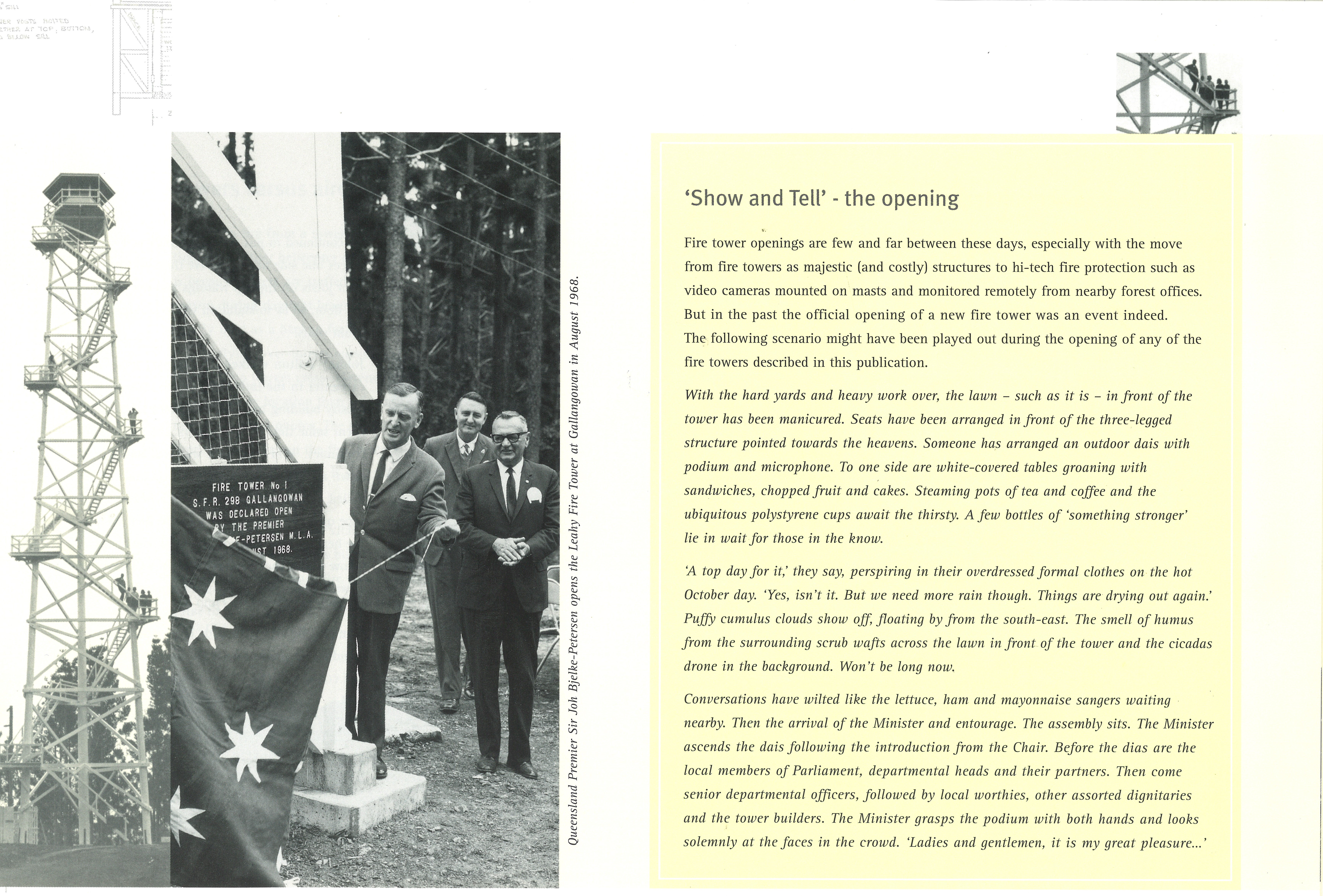 “Gallangowan Forestry Reserve has a fire tower that was, when it was built, the highest in Queensland – 134 feet. It gives a view for miles around. At the top is a circular map in the cabin giving degrees latitude and longitude. The Reserve is also supplied with fire-fighting equipment. Water is supplied from a well and pumped into two 20 000 gallon tanks on a nearby hill to give pressure. The nursery uses a large amount of water. The population of the Reserve has fluctuated over the years, according to the workforce required at the time. It was probably at its zenith when Mr V Williams was in charge of the reserve in the sixties. It is 50km from Goomeri and about the same distance from Murgon and Nanango. Its isolation has been broken down by better roads, and the provision of a school bus service so that local children can attend secondary school in Goomeri. The settlement has its own primary school which also caters for children on nearby properties.”