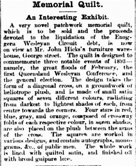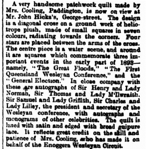 To complement the touring quilt exhibition, The Fabric of Gympie will also be on view which will showcase two historical quilts from the Gympie region one dating from 1893. For Gympie, 1893 was the year during which the highest flood was ever recorded, and a young Andrew Fisher won the seat of Gympie in the Queensland Legislative Assembly. The quilt records those momentous events as well as the Wesleyan Conference on many of the blocks. The quilt is generously on loan from the Rotary Club of Gympie.
