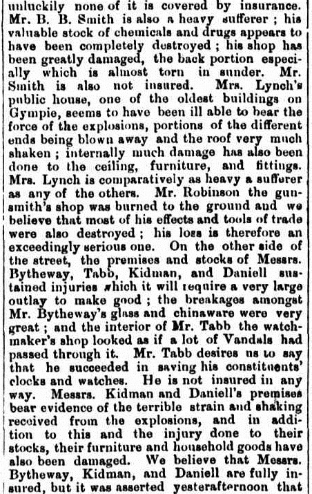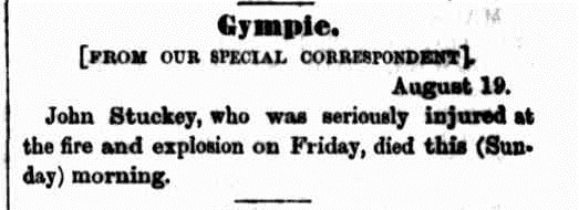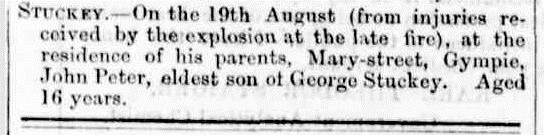 Sadly, you will have read that young John Stuckey, aged 16 years died from injuries sustained in the second explosion. He was the son of fruiterer George Stuckey*. Their store and residence was in Central Mary Street.