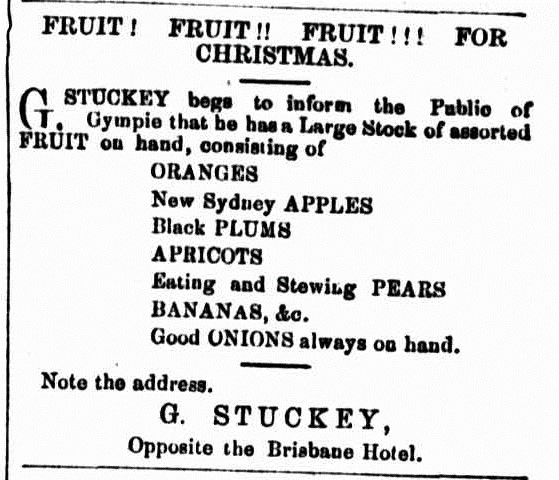 *George Stuckey, father of John Stuckey was a Fruiterer in Central Mary Street. He also later became the Manager at the Gympie Branch of the Wide Bay and Burnett Farmers Cooperative Co. Ltd. Circa 1885, George opened the Kanyan Hotel at Kilkivan Junction (Kilkivan railway junction, now Theebine) whilst also farming in the district and breeding fine horses.