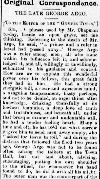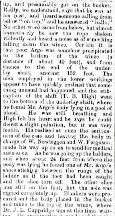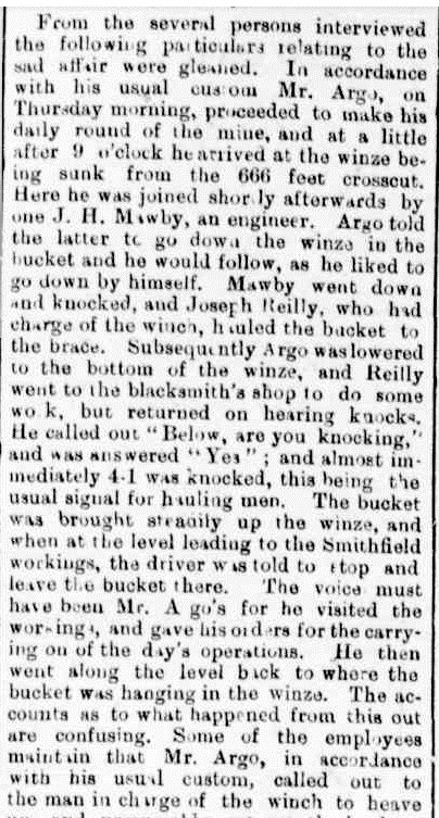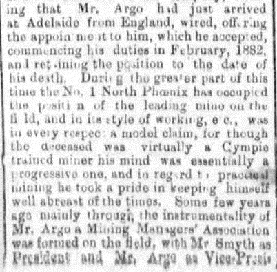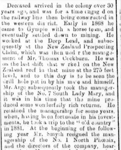 George Argo was a Gympie Mining Manager. Highly respected, firm but just, and devoted to his duty and the welfare of the mining employees (1). On 21 February 1895, at approximately 9am in the morning, he tragically plunged to his death, 200 feet down a winze* at the No. 1 North Phoenix Mine. He was 54 years of age. Argo’s death was in conversation for many years, as to how could an experience mine manager just fall down the mine shaft?