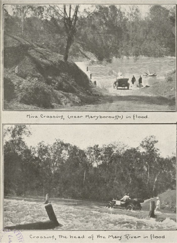 Take a look at two of those images……one featuring Miva Crossing and the other with an early motor vehicle traversing a flooded Mary River!