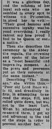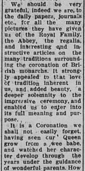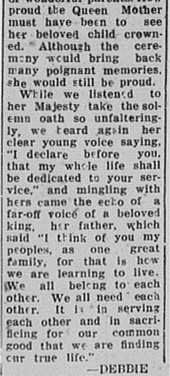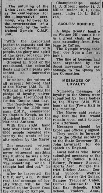 A regular columnist in The Gympie Times, “Debbie Doings”, reports on the Queen’s Coronation celebrations, published 4 June 1953: