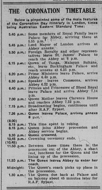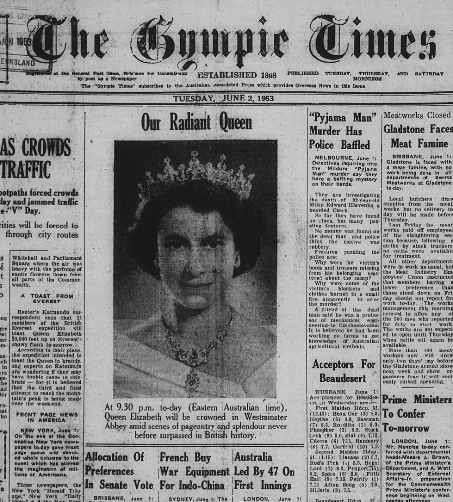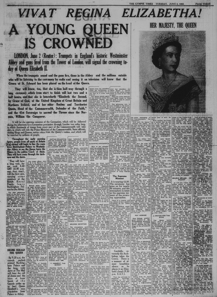 Here are the reports printed in The Gympie Times on the day of the Queen’s Coronation, 2 June 1953, including the Coronation timetable: