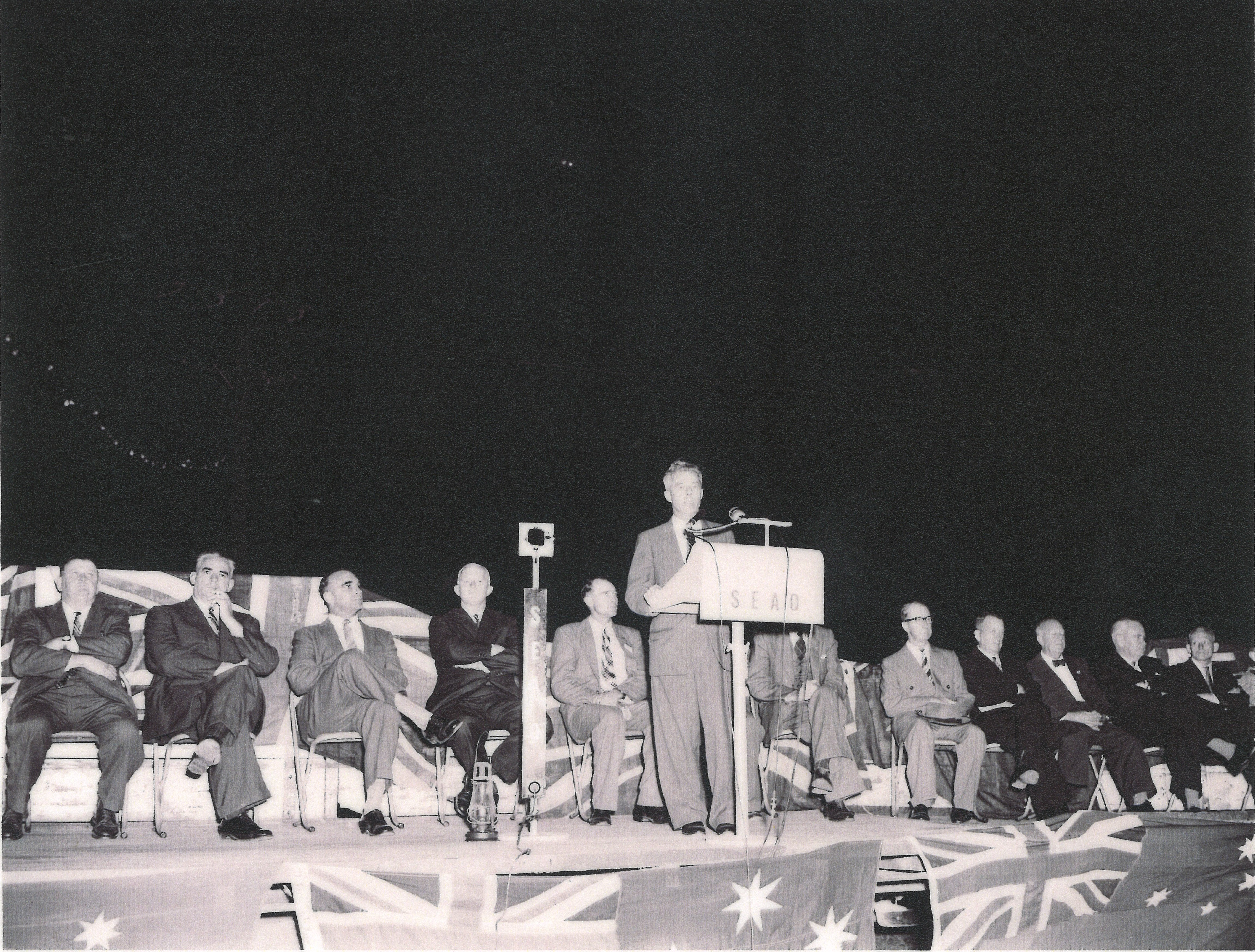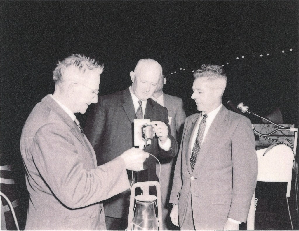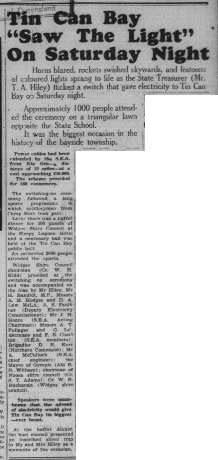 In the year of 1959 Tin Can Bay was upgraded from old Kerosene lamps to Electric Light. This event was honoured with a switching on ceremony which was planned to capture the attention of the audience. Before the dramatic moment when the State Treasurer Mr T. A Hiley threw the switch to make the street a blaze of coloured lights, he would extinguish a kerosene lamp, to symbolise the passing of the kerosene lamp era for Tin Can Bay.