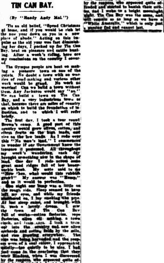 A gentleman by the name of Andy Mal wrote into the Maryborough Chronical “Tis an old belief, ‘Spend Christmas at home, and if you would be rich let the new year down on you in a new place of abode.’ Acting on this impulse as the old year was fast diminishing her day, I packed up for Tin Can Bay, bent on pleasure and cattle hunting. After a week’s riding, here are my conclusions on the country I covered. The Gympie people are bent on making a pleasure town on the point. No doubt a town with no worries of road making and various other work would be grand. No work no worries! Can we build a town without them. We can build a town on Tin Can Bay and a very industrious town at that, because there are miles of country on which to build the foundation of the industries and to which I will refer briefly. … A good part of this country would grow olives, cotton and fruits as the high lands and rice on the low lands…I commenced to wonder if our Government knew the treasure it possessed. All throughout my weeks wondering each day brought something new in the shape of the land. One day I rode across some great sand ridges full of low honey suckle bush. My mate said to me now then what would this rubbish grow? My answer was Hemp and so it would to perfection. … Sleep seemed to have left my eyes and while my friends slumbered on I lay smoking the pipe. At last sleep came and brought with it such a lovely dream. I saw the town of Tin Can. Full of workers – cotton factories, rope factories, olive oil making, a town clock and tram cars.”