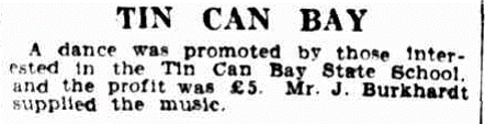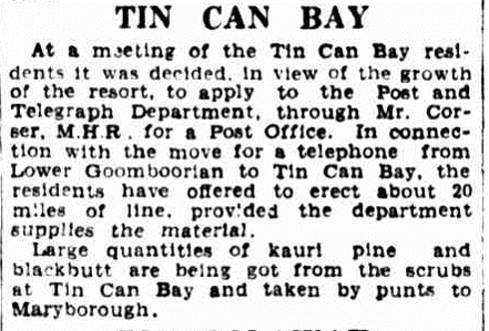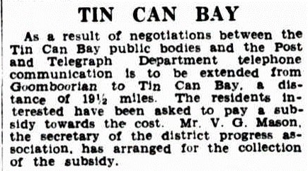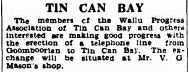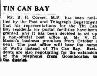 In 1934 when Mr. B. H. Corser. M.P., was notified by the Post and Telegraph Department that his representations for the Tin Can Bay residents to have postal facilities had been granted and that it had been decided to set up a non-official post office at Mr. V. G. Masons business premises, they were told that the post office would bear the name of Wallu instead of Tin Can Bay.