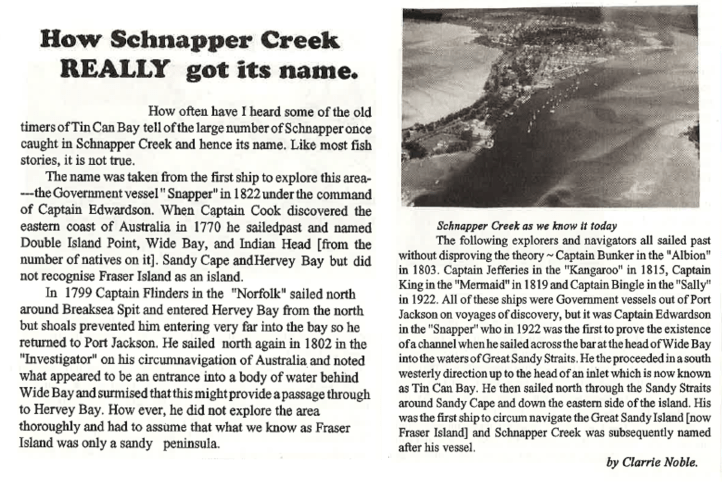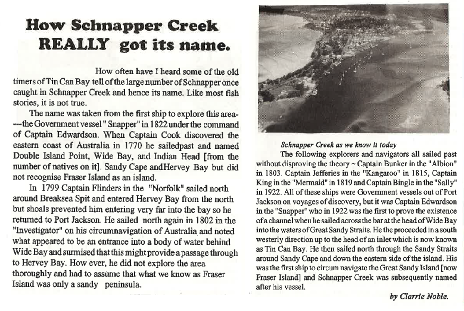 An article in Cooloola Lifestyle (date unknown) tells us where Snapper may have come from but does not explain how it went from Schnapper to Snapper or vice versa. [We cannot find any official reference to it being named after the vessel].