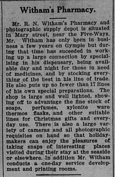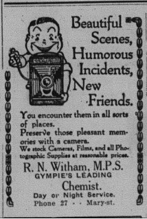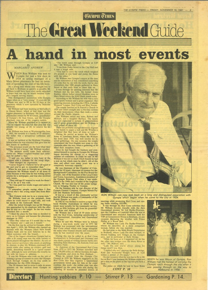Ron Witham was born in Woollongabba on 8 June 1902 and came to Gympie in 1924 as a relieving pharmacist but stayed on. He went on to buy a pharmacy in Mary Street near the Fiveways, that later became Meldrum’s Pharmacy. (the building is Meldrum House in lower Mary Street).