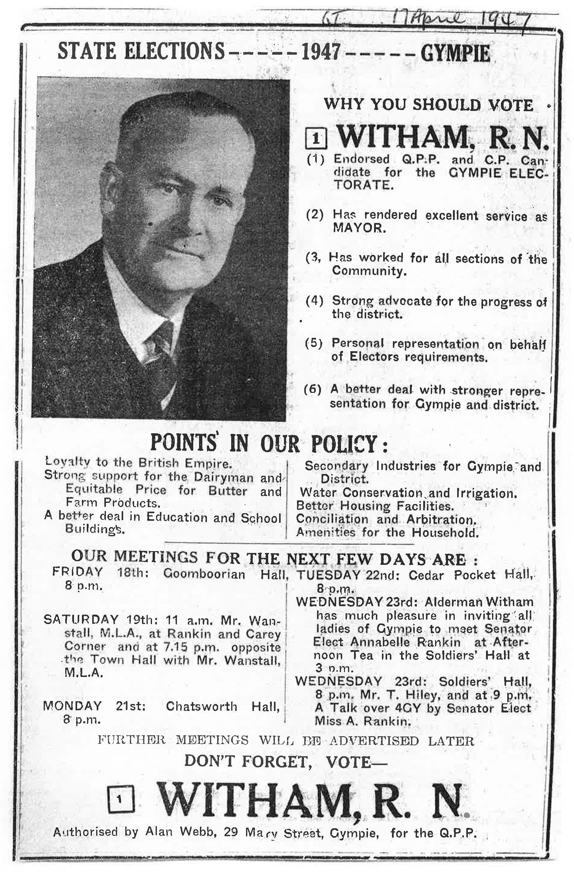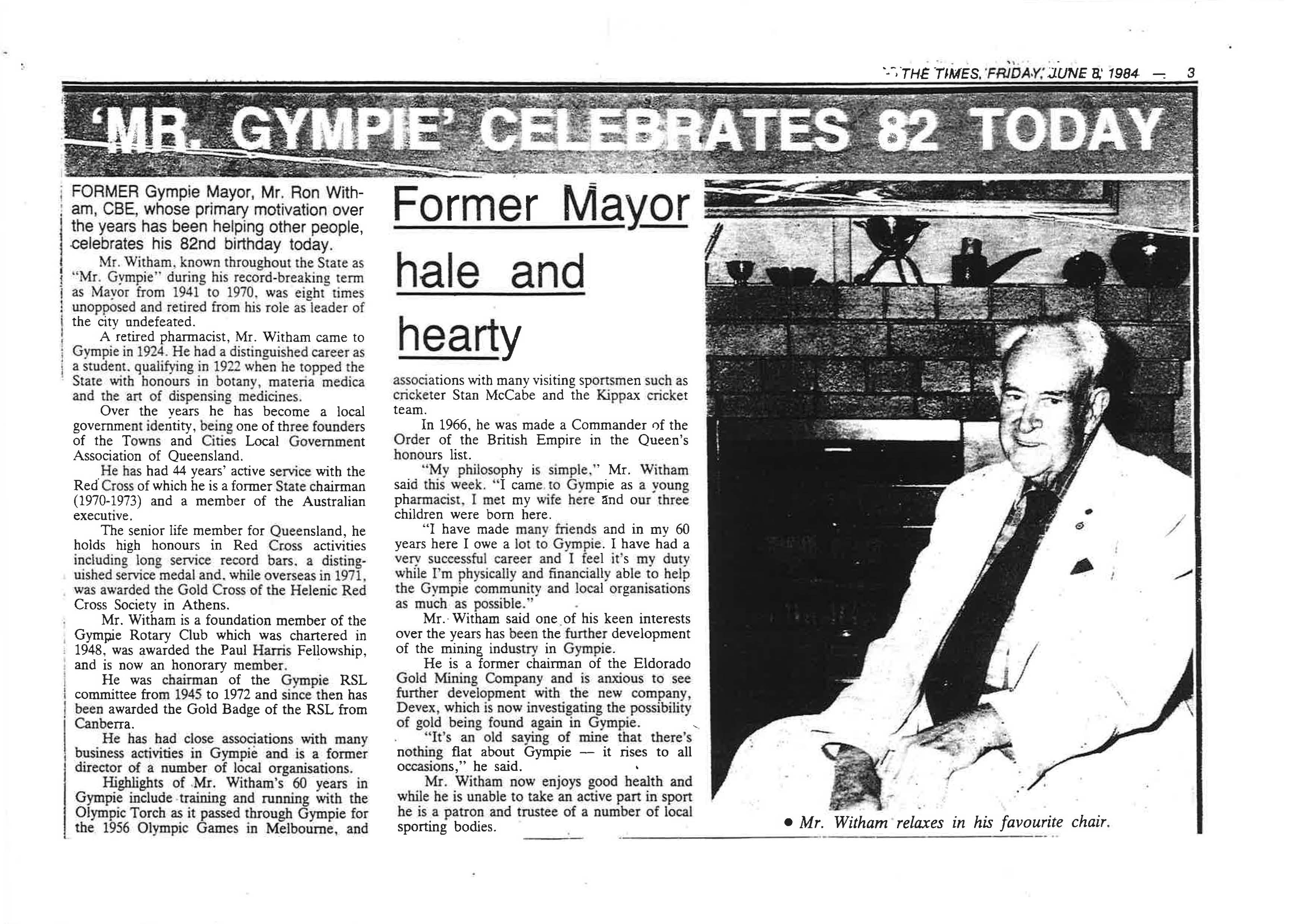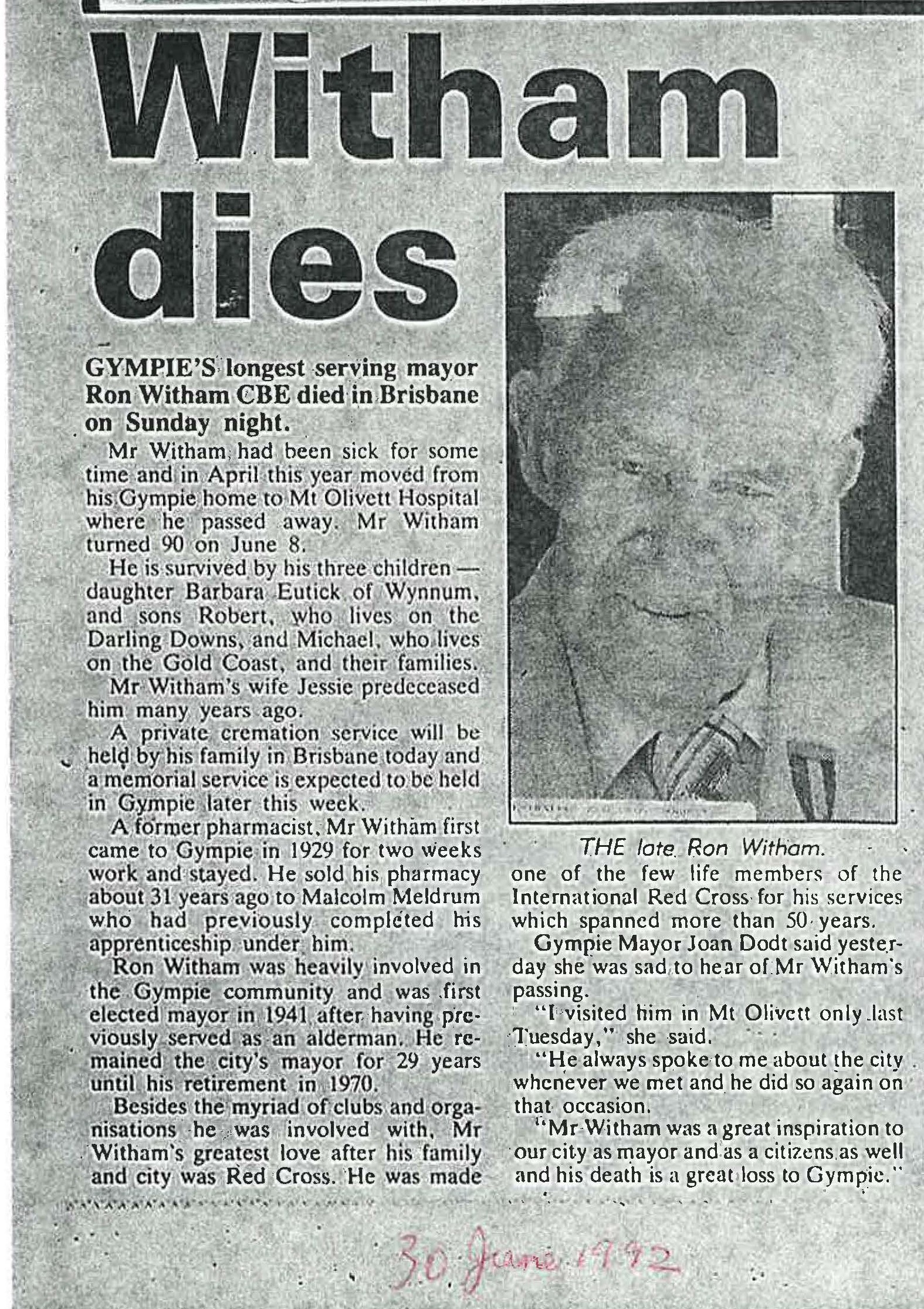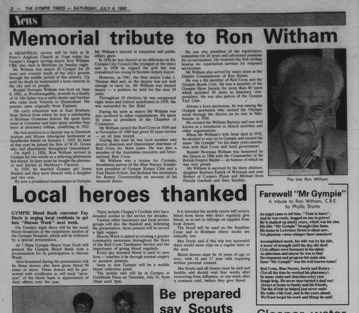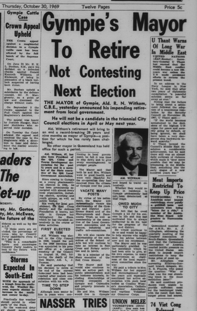 Ronald Newman Witham (CBE) was Gympie’s mayor from 1941 until 1970.