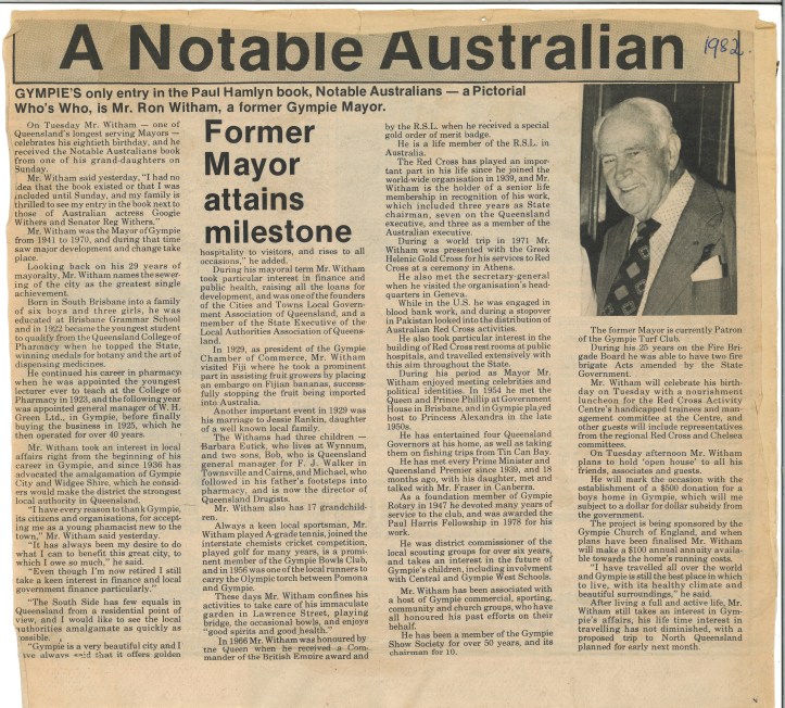 In 1941, after then mayor, Luke J Thomas passed away, and the deputy was not well, Ron Witham became mayor of Gympie. – a position he held until his retirement in 1970.
