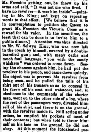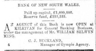 The goldfields and surrounding were harsh and dangerous times. Gold and money were transported on the mail routes by the Cobb and Co coaches and were most certainly a target for roving bushrangers. One such incident occurred on 6th January 1869, just south of Gympie. The coach had just left Gympie heading for Brisbane, full of the mail and several local businessmen. One of which was Willaim Selwyn King, the manager of the Kilkivan branch of the Bank of New South Wales who was escorting 2000 pounds in half notes for delivery to Brisbane then onward to head office in Sydney. (The talk of the town was that it was a risky trip and bets were already being placed the evening before of 5 to 1 odds on the likelihood of it being held up).