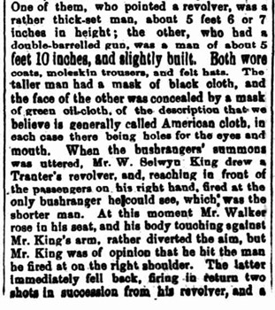 But what makes this story, wilder than the bushrangers, is that bank manager, Selwyn King was no pushover. He did not surrender and he pulled out his own Tranter revolver and immediately fired at the lead bushranger, who after a stagger and quick recover, replied fire of three shots back.