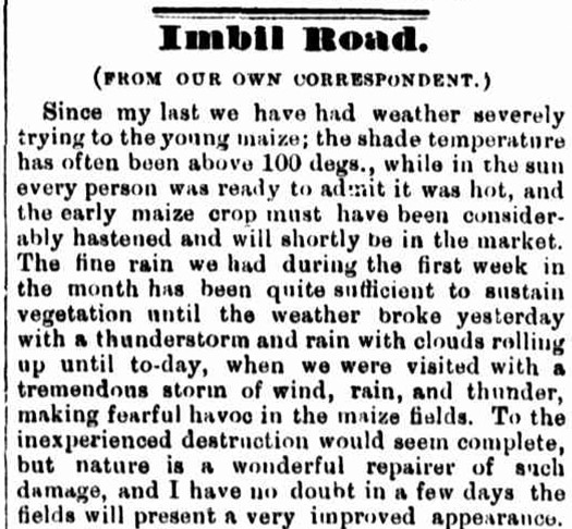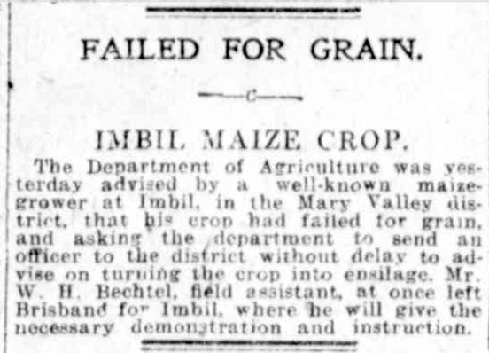 Maize was grown for the grain, sent to market in bags rather than for the dinner plate as a fresh corn on the cob. It was grown in the Mary Valley district as well as other parts of the region such as Pie Creek and northside of Gympie from early pastoral settlement.