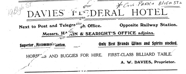 Advertisement for Davies Federal Hotel (year unknown). Advertisement source: Kilkivan Historical Museum.