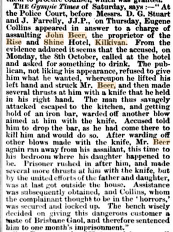 It wasn’t easy being a publican in those days, as I am sure John Beer would have told you. In 1883, he refused a man a drink at his hotel (not liking the man’s appearance), at which the would-be customer threatened Mr Beer with a knife and chased him around the hotel into his daughter’s room. Thankfully both John and his daughter were able to escape unharmed and the man was sentenced to one month’s imprisonment in Brisbane Gaol (see article below).