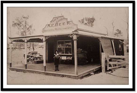 One of the earlier businesses in town was a shop owned by Ann Elizabeth Beer. Ann and John Beer originally came from Ballarat, Victoria and came to Kilkivan originally for the gold rush. Shortly after, John became the licensee of the Rise and Shine Hotel at Kilkivan. Helping John with the running of this hotel gave Ann the confidence to open her own store. During the 1911 land sale, Ann purchased Lot 4, section V in Moore Street. On this site, she opened a small shop which sold fruit, vegetables, bread, eggs, drinks, matches, cigarettes, newspapers and sweets (Logan, 1988).