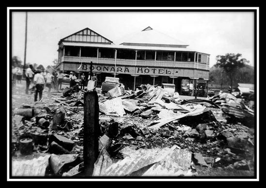 Boonara Hotel, 1938. The rubble in front of the hotel is the result of a fire at the Grand Hotel, which was directly across the road from the Boonara Hotel. Photo source: State Library of Queensland.