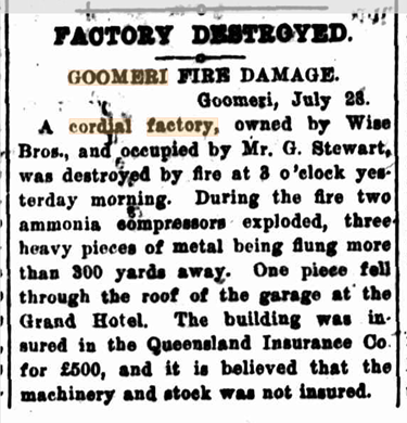 Mr Stewart and Mr Sawtell started a cordial factory at the old shop owned by the Wise brothers in Goomeri. Unfortunately, a fire destroyed the cordial factory in July of 1929. I would like to share with you a recollection of this event from Mrs May Stewart, which is recorded in the book “Neverending Stories”. She recalled, “During the fire, the gas cylinders burst, hurling pieces of cylinder all over the town. One piece cut a hole in the cement path in front of shops, another piece was at the post office and another went through the garage roof at the hotel. After the fire, Gordon went looking for another piece of land to start again. So they obtained some land from the Rawlings near the end of Jones Street. So they built a new factory and started again. A man by the name of Dick Parke called and asked Gordon if he needed a hand, and so Gordon gave Dick the job. Later on, Dick Parke then purchased the factory from Gordon Stewart. Following that, the factory was also owned by the Finnemores”(Goomeri Heritage Writers group, 2000).