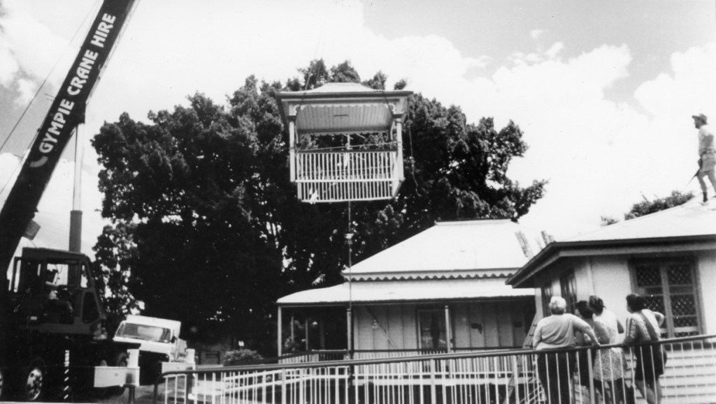 The observation tower being removed from 1 Church Street, Gympie in 1999. Source: Gympie Library Photograph Collection.